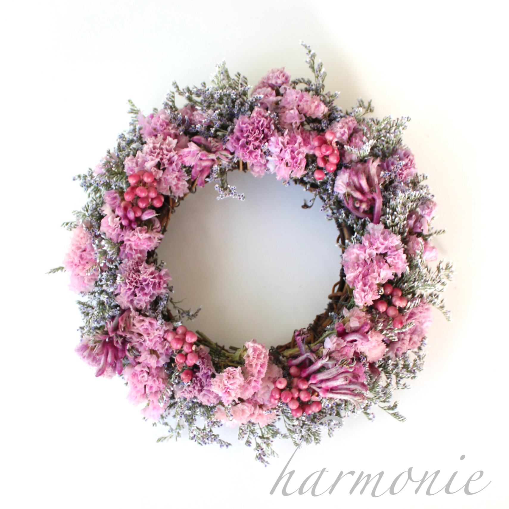 中間色が美しいリモニウムを使用した小さな花の色の重なりが美しいリースです。